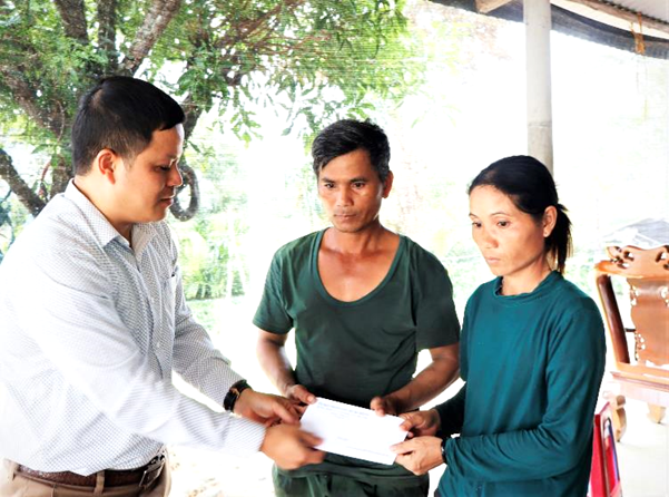 Phó chủ tịch UBND xã Ba Động Nguyễn Xuân Viễn trao quà của Ban an toàn giao thông tỉnh Quảng Ngãi cho đại diện gia đình.
