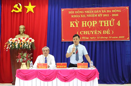 Chiều ngày 15/10/2025, HĐND xã Ba Động khóa XII, nhiệm kỳ 2021 - 2026 đã tổ chức Kỳ họp lần thứ 4 - Kỳ họp chuyên đề, để thảo luận, cho ý kiến và quyết định các vấn đề thuộc thẩm quyền. Kỳ họp do đồng chí Đinh Xuân Hòa - Phó, Bí thư Thường trực Đảng ủy, Chủ tịch HĐND xã và đồng chí Nguyễn Hữu Tuyến - Ủy viên Ban thường vụ Đảng ủy, Phó Chủ tịch HĐND xã Ba Động đồng chủ trì. Dự kỳ họp có đồng chí Nguyễn Văn Sinh – Chủ tịch UBND xã; các Phó chủ tịch UBND xã; lãnh đạo các phòng ban, đơn vị có liên quan và các đại biểu HĐND xã Ba Động khóa XII, nhiệm kỳ 2021 - 2026.